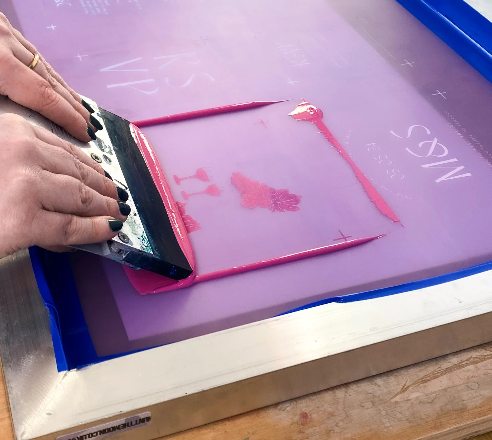 Screen printing is a process of pressing ink through a stencilled mesh screen with a squeegee to create a printed design.