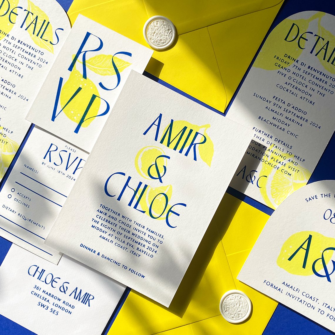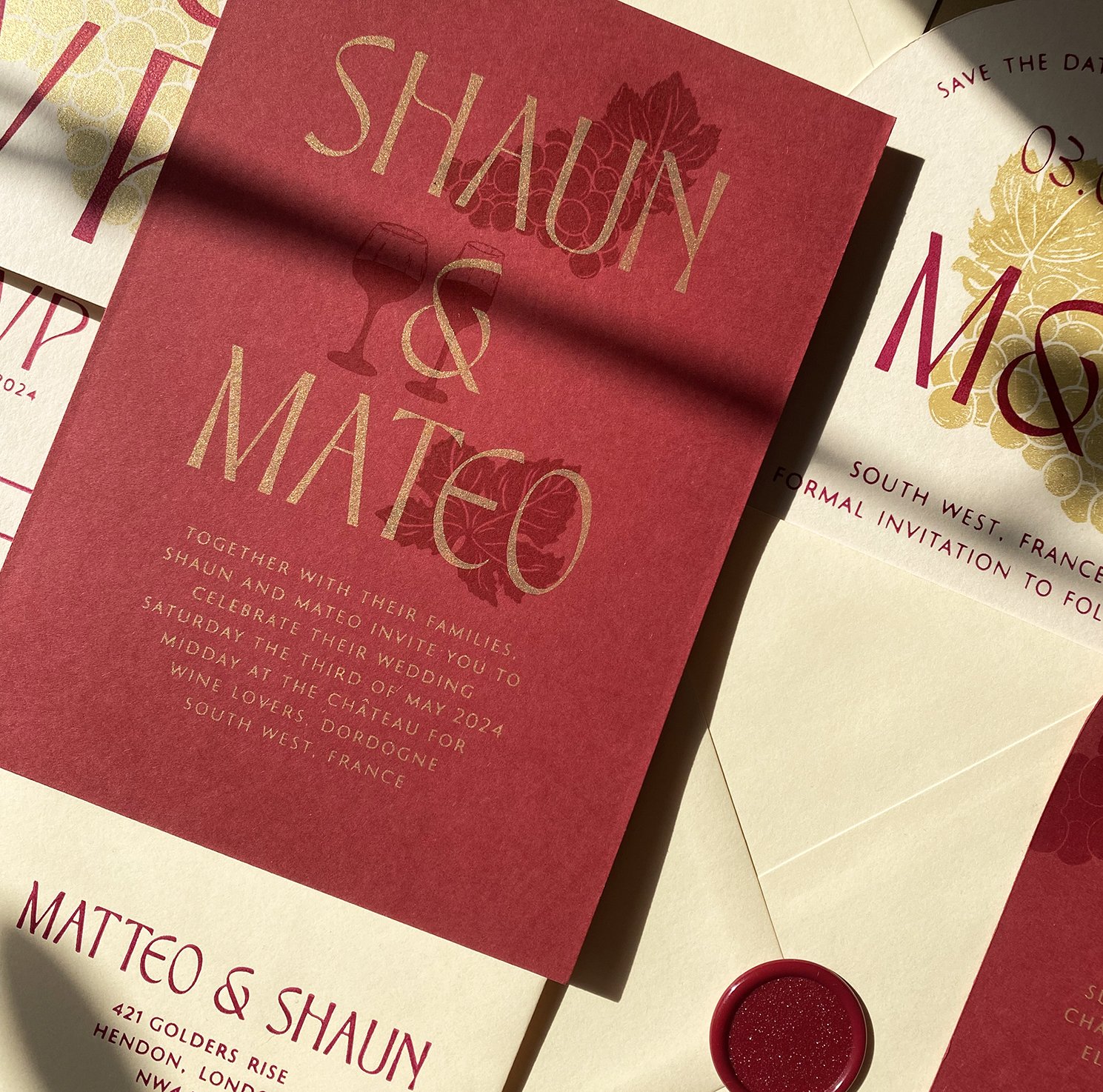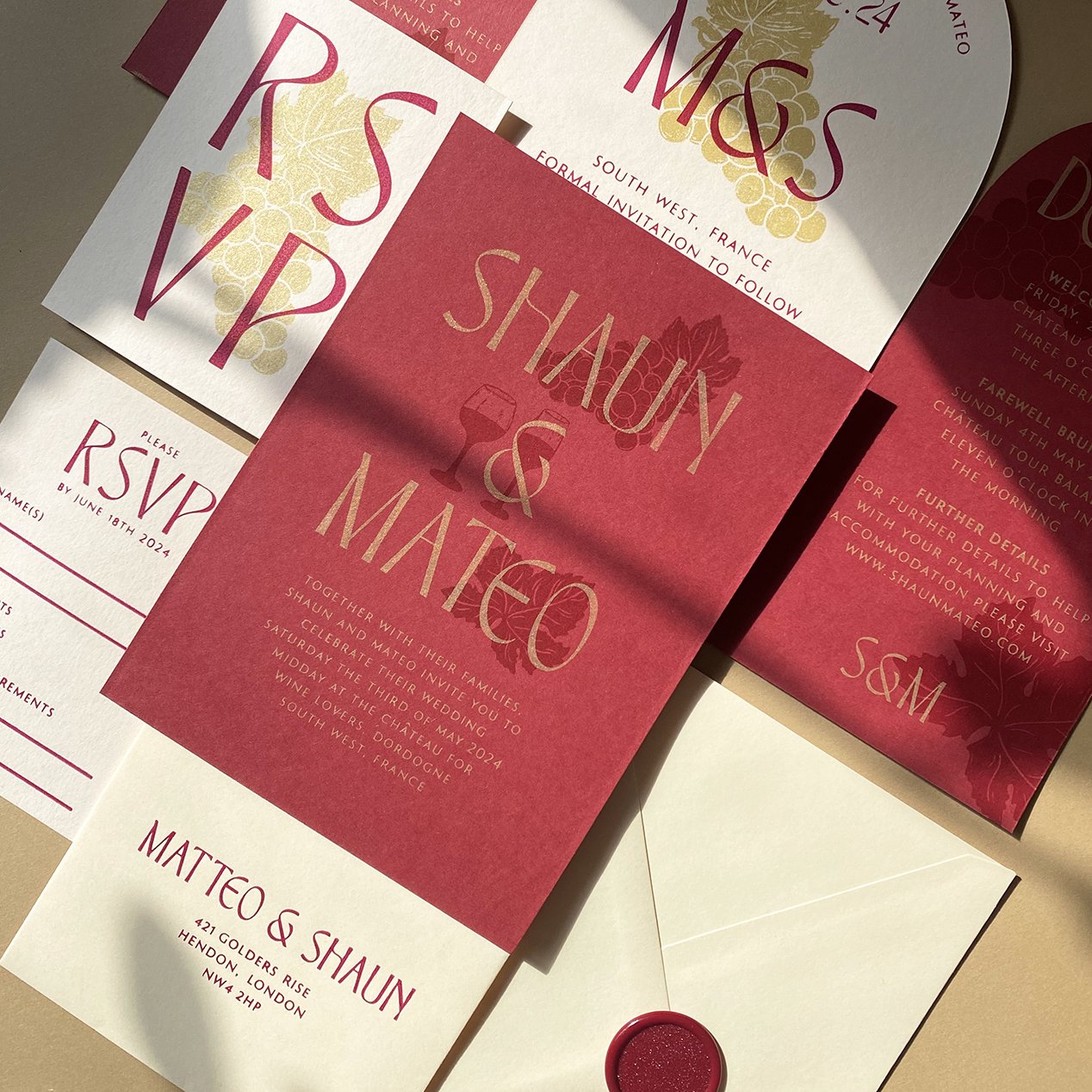 Includes: Save The Date, Invitation, Details card, R.S.V.P (with printed return address), wax seals, all envelopes and a coloured envelope liner.