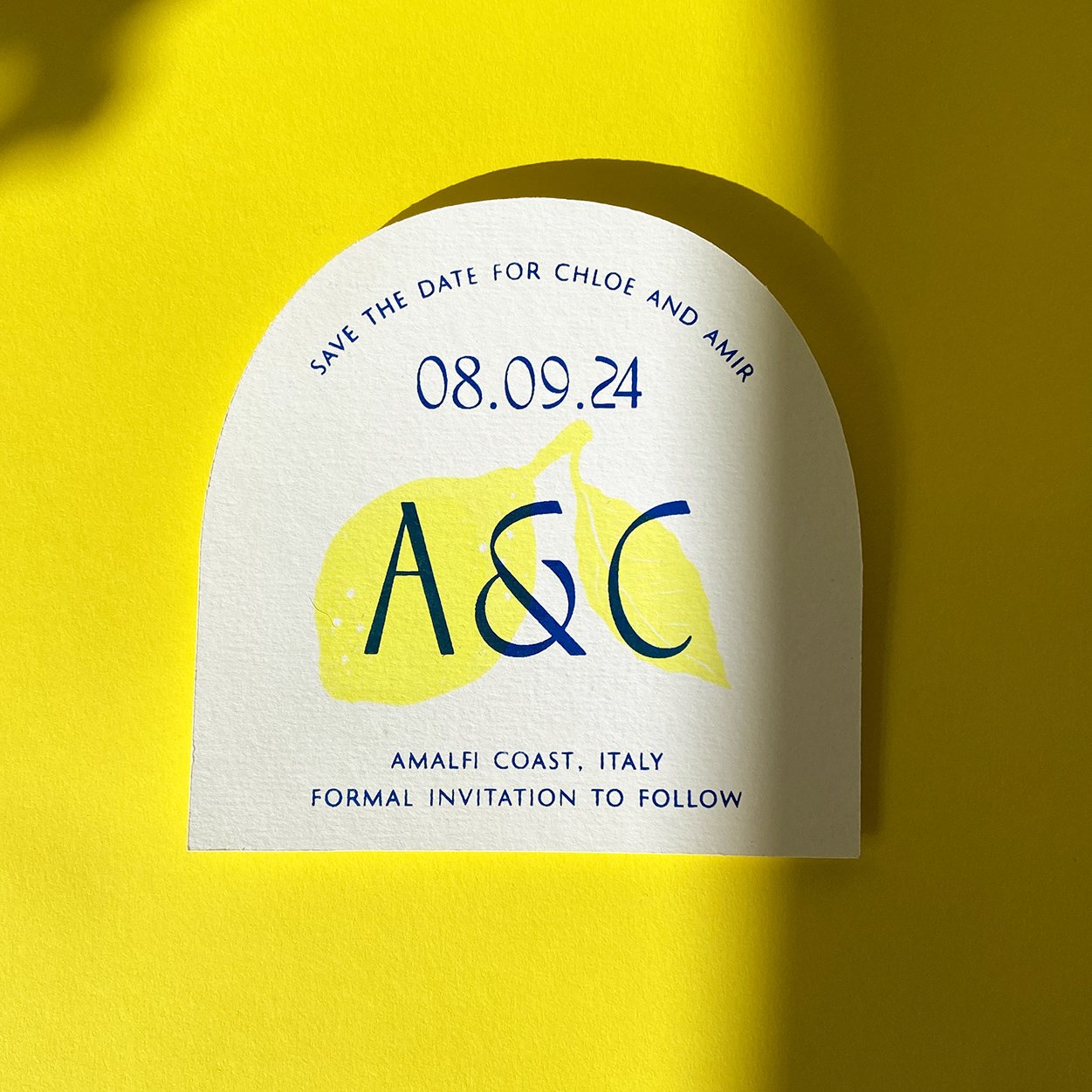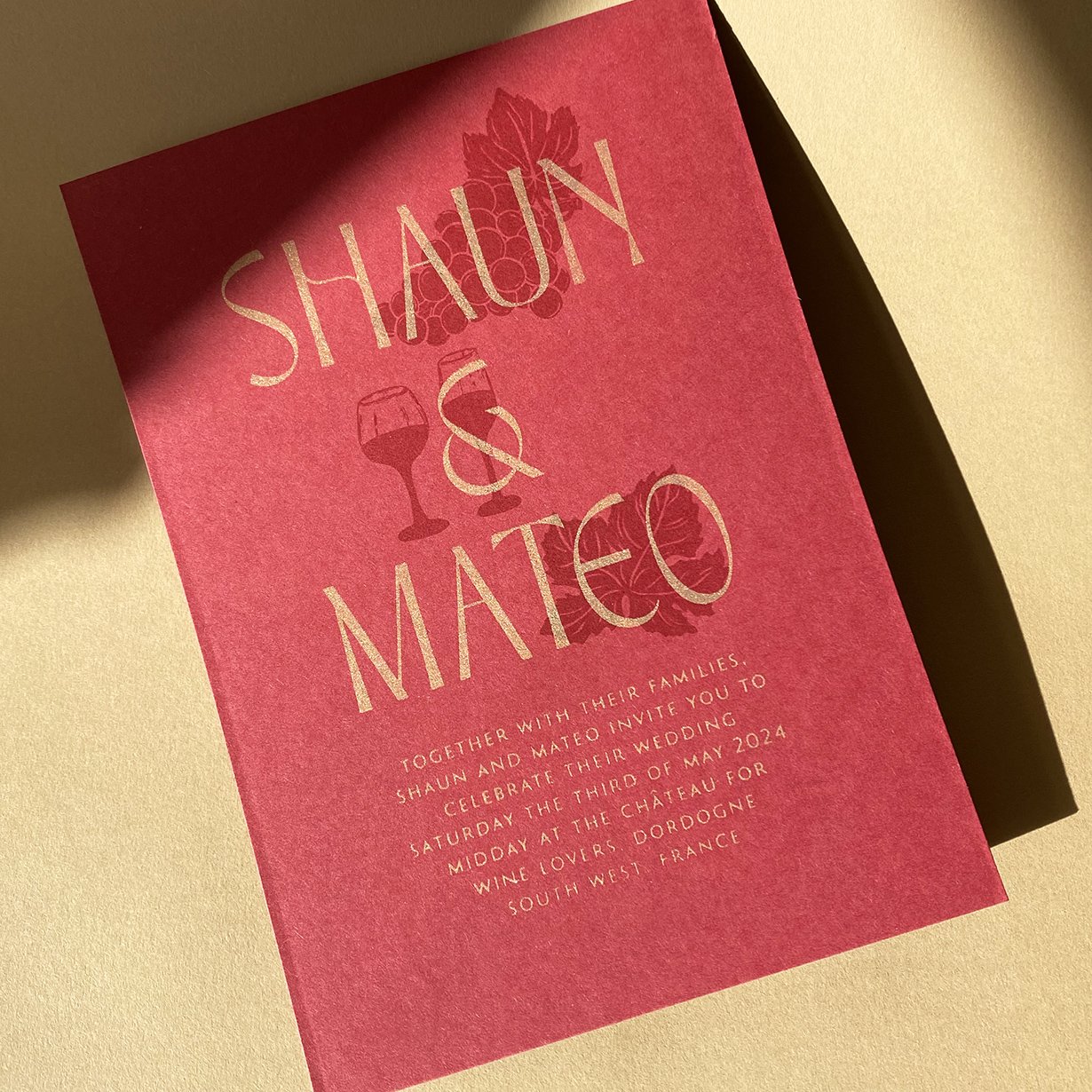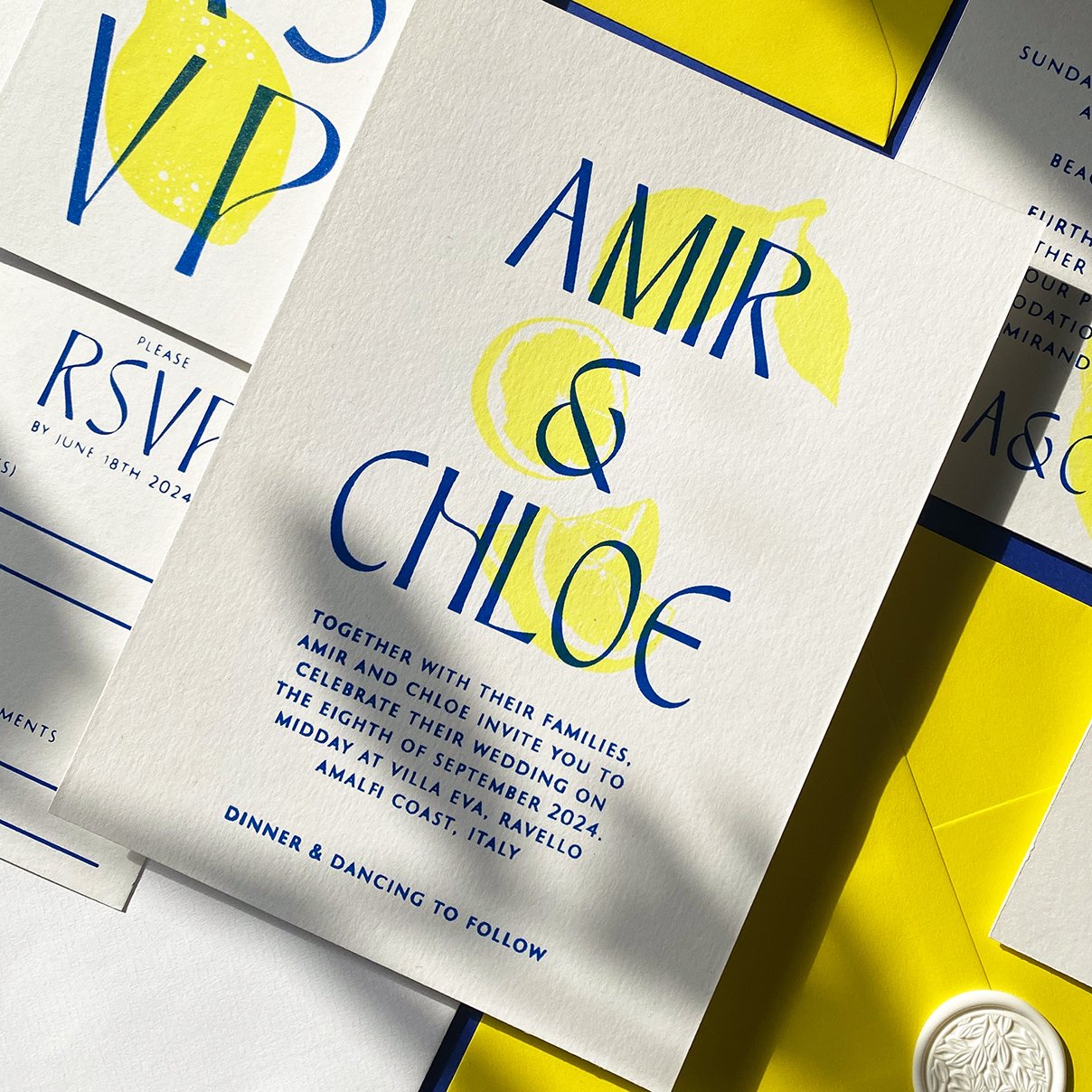 Includes: Save The Date, Invitation, Details card, R.S.V.P (with printed return address), wax seals, all envelopes and a coloured envelope liner.