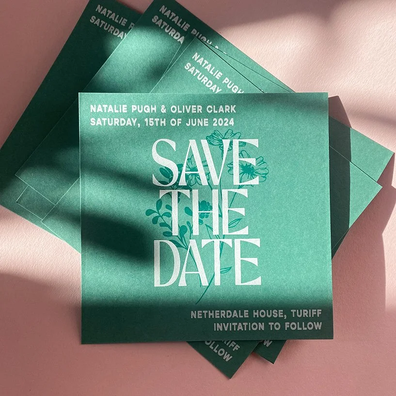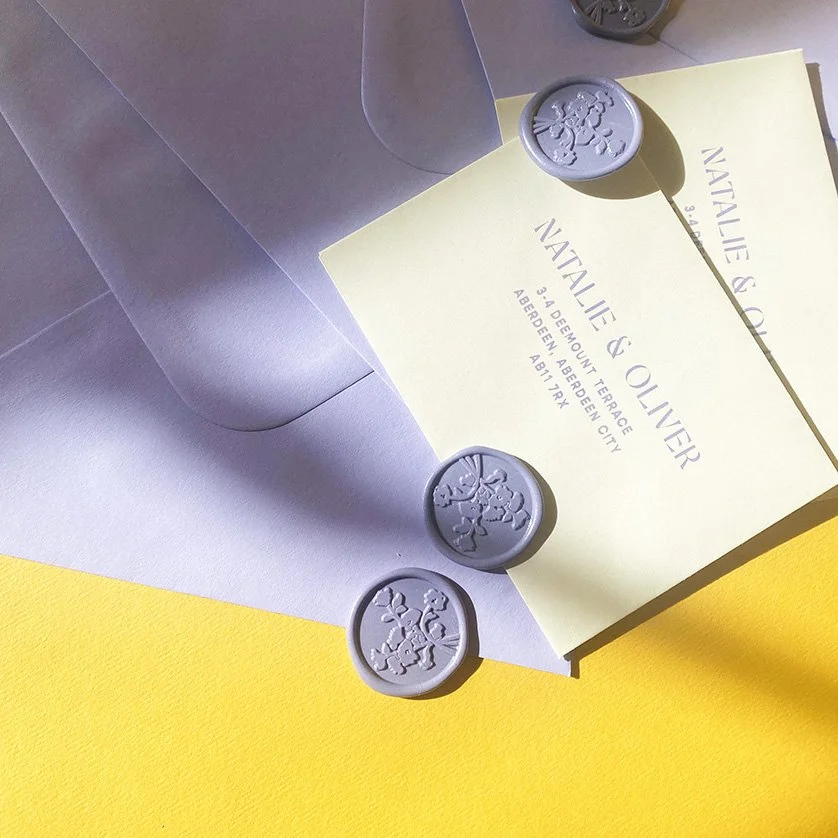 Includes: Save The Date, Invitation, Details card, R.S.V.P (with printed return address), wax seals, all envelopes and a coloured envelope liner.