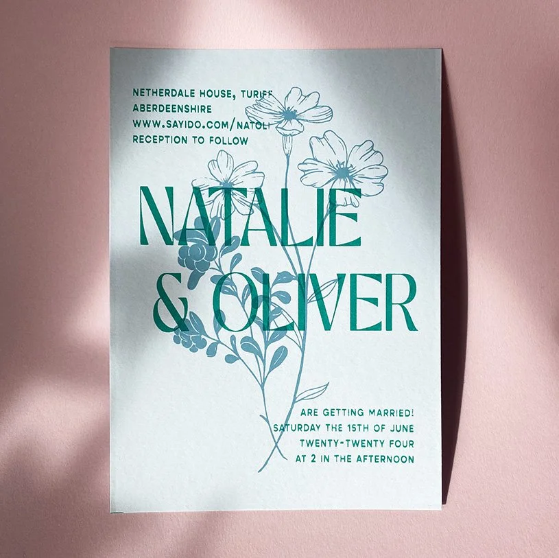 The main event! featuring a custom floral illustration and your names in large, graphic type
